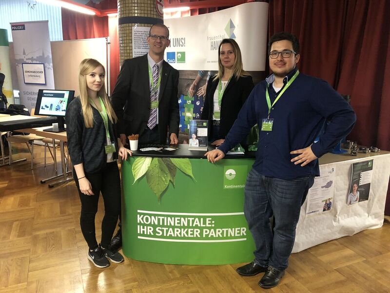 Nachdem wir die Lehrlingsausbildung der Kontinentale kurz auf der Bühne vorgestellt hatten, stand das Team – bestehend aus zwei Lehrlingsbeauftragten und zwei Lehrlingen im 3. Lehrjahr – den Schülern und ihren Eltern am Messestand für weitere Auskünfte zur Verfügung.